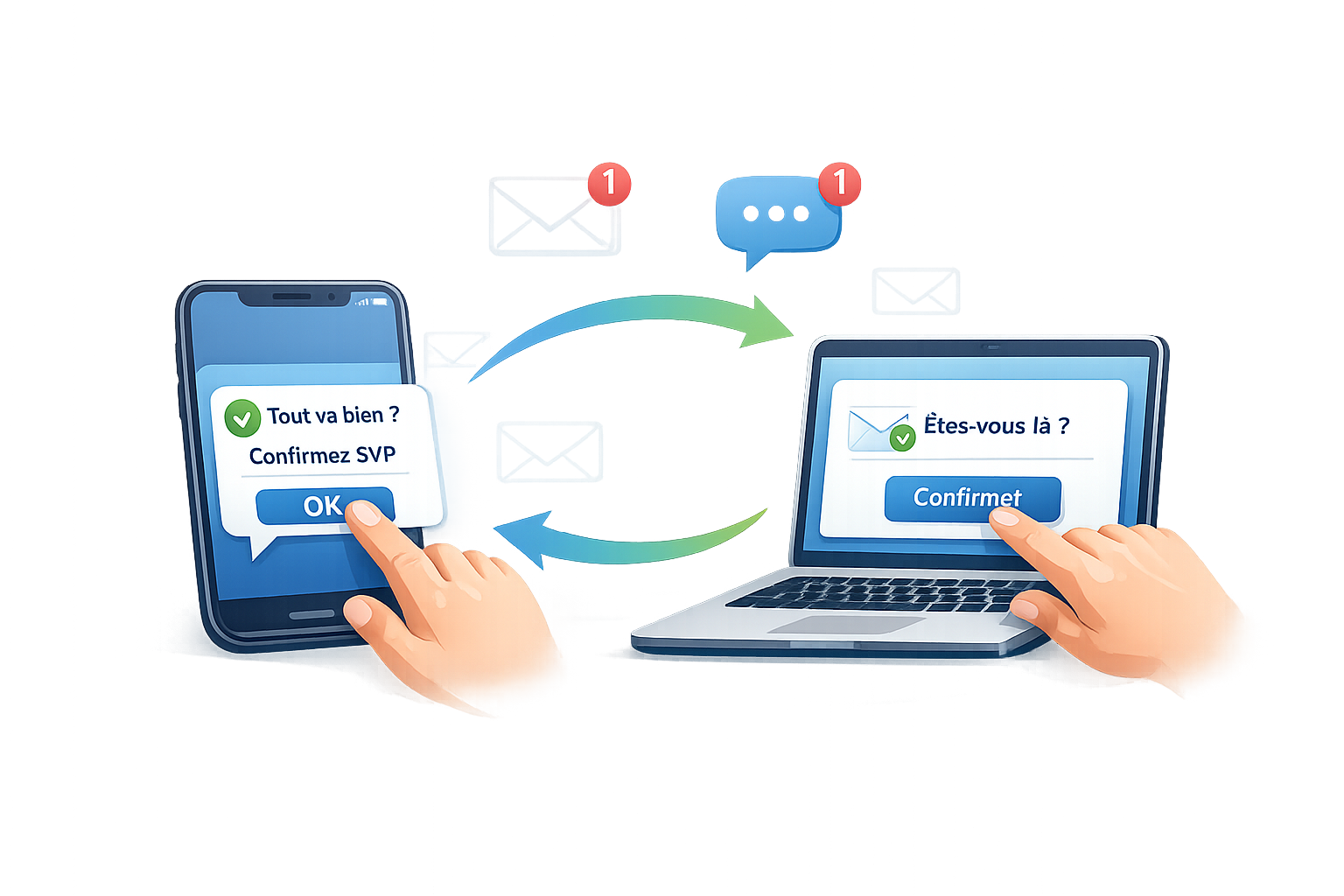 Régulièrement, nous vous envoyons un e-mail ou un SMS pour vérifier que tout va bien. Un simple confirmation en un clic suffit.