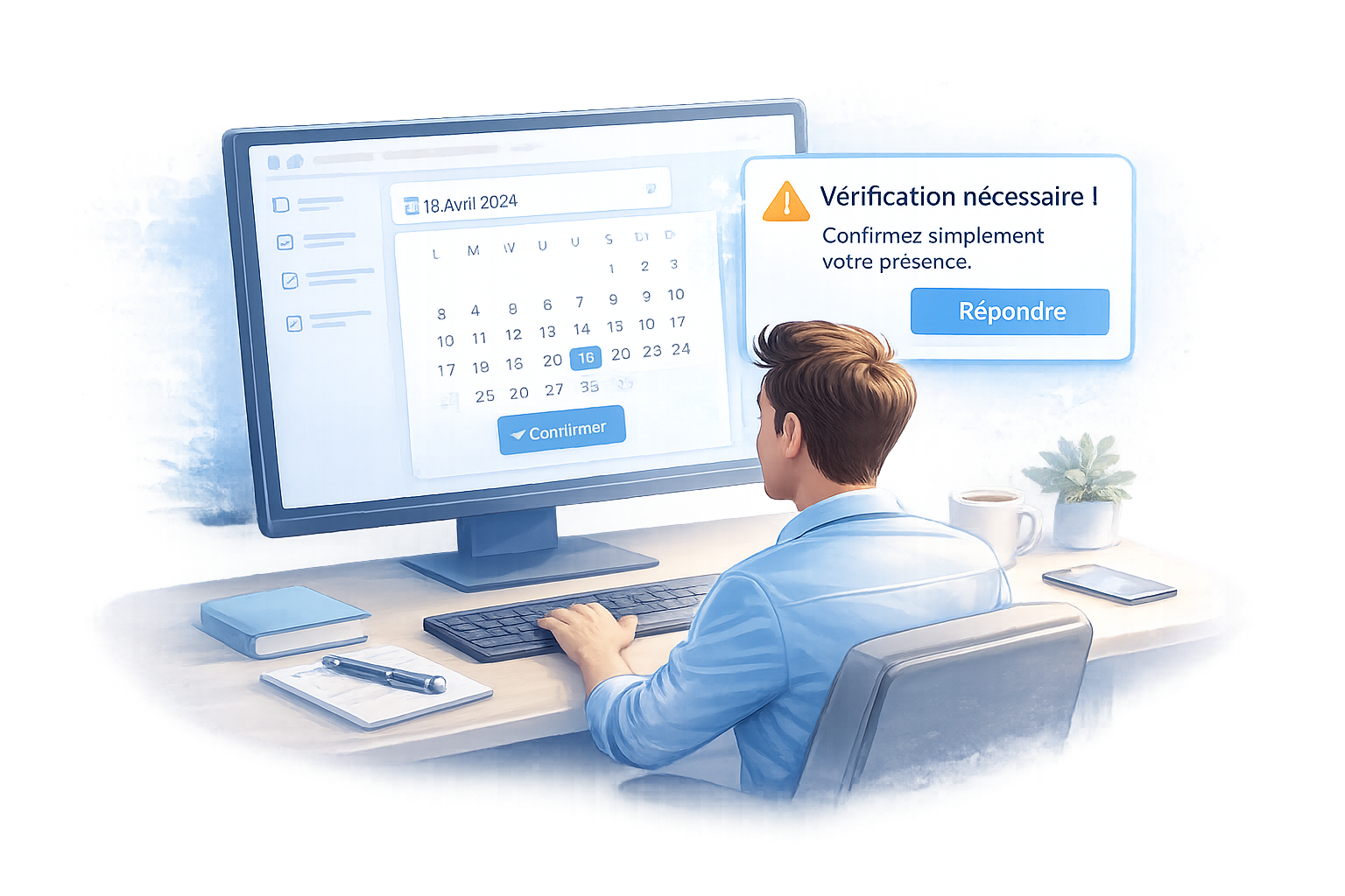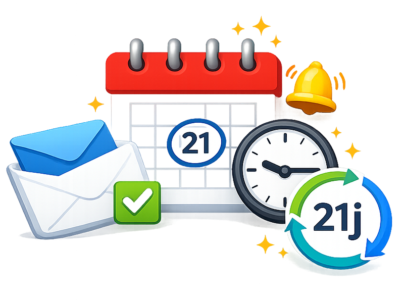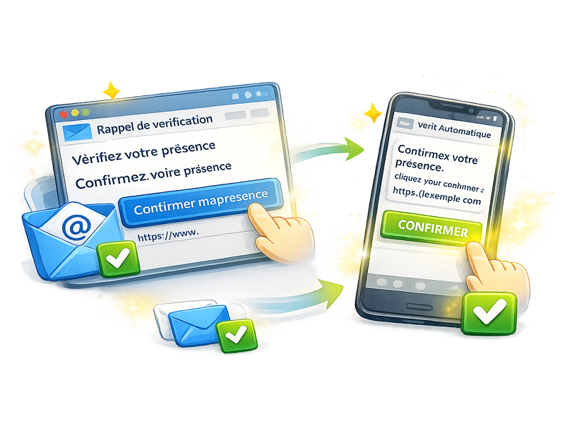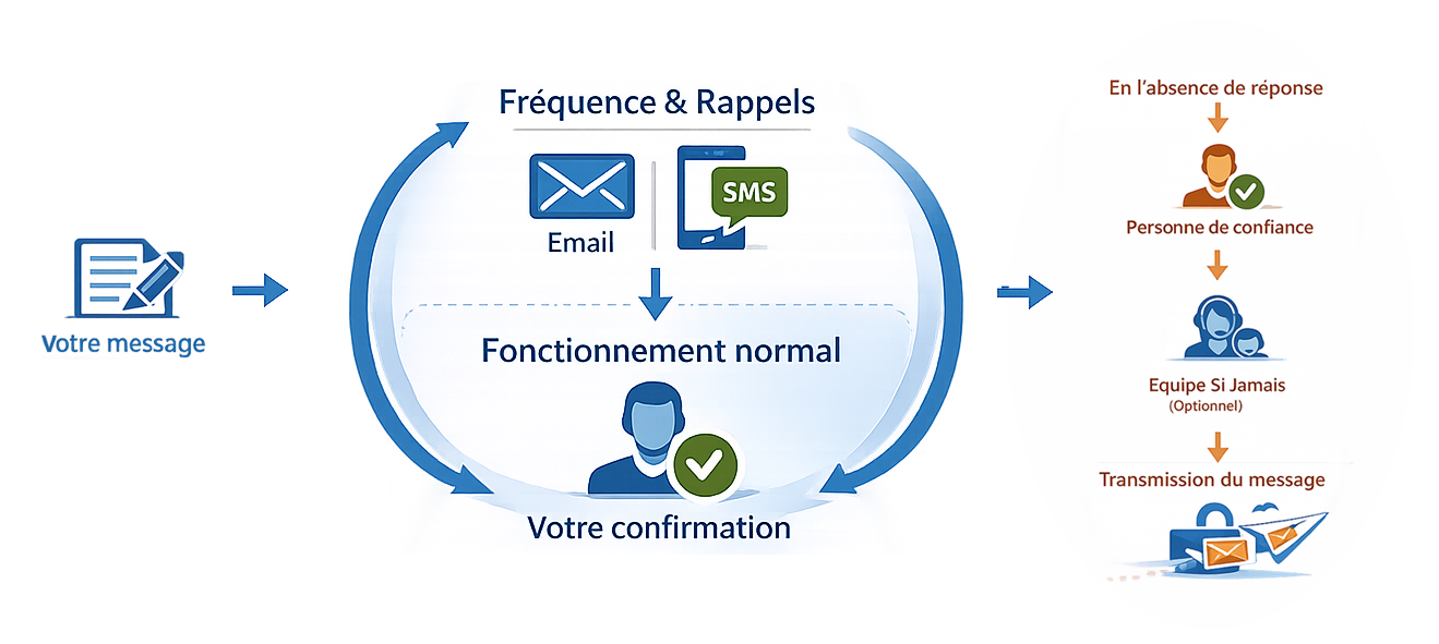 Lors de la rédaction de votre message, vous choisissez une fréquence de vérification, par exemple tous les 21 jours.Peu avant l’échéance, un rappel vous est envoyé. Un simple clic suffit pour confirmer votre présence.
