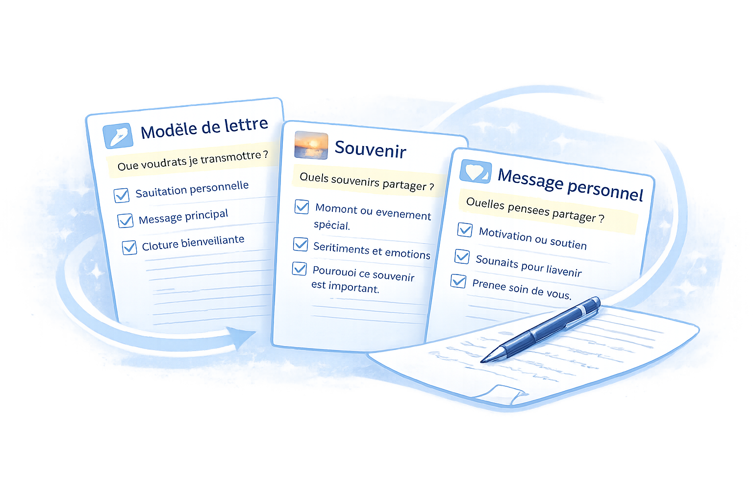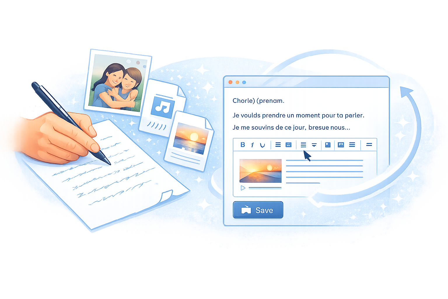 Tout commence par vos mots. Vous écrivez librement et pouvez ajouter des images ou joindre des fichiers pour transmettre ce qui vous tient à cœur. Votre message reste accessible à tout moment : vous pouvez le modifier, l’enrichir ou le supprimer selon vos besoins.